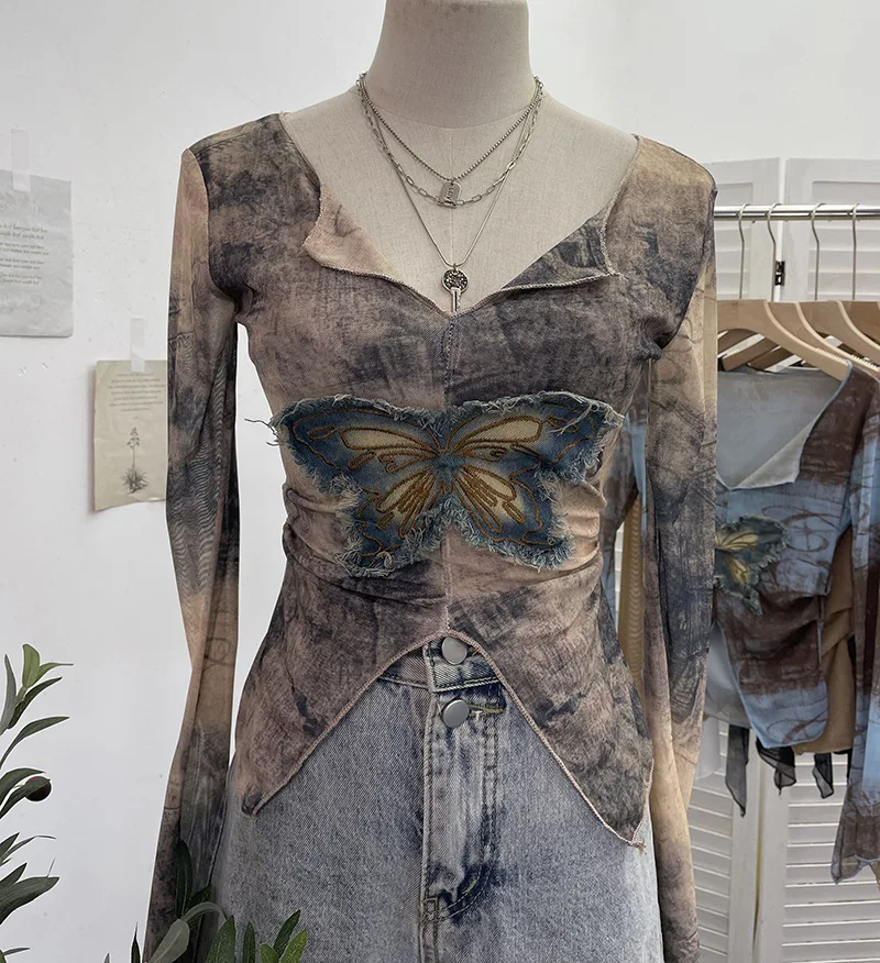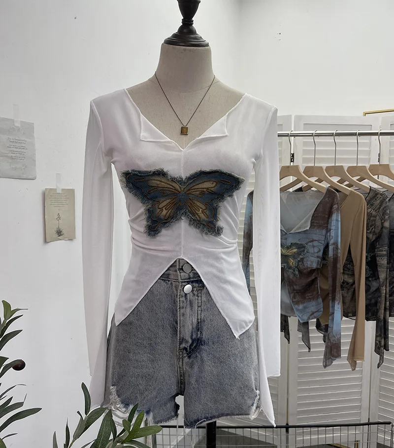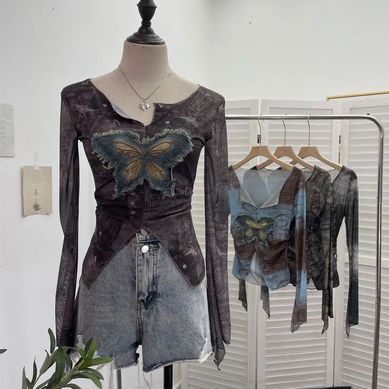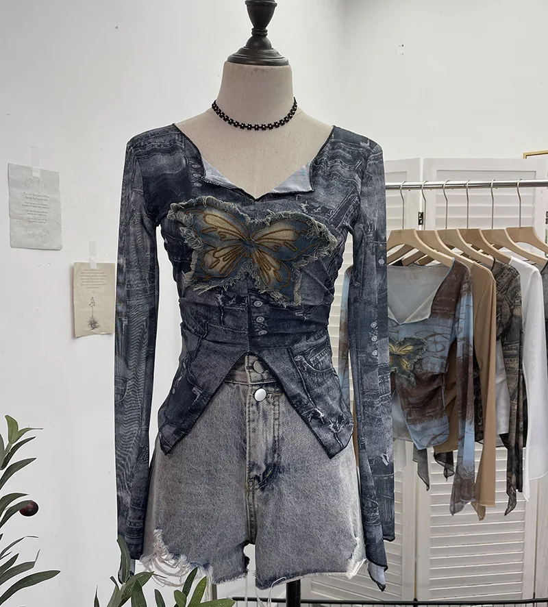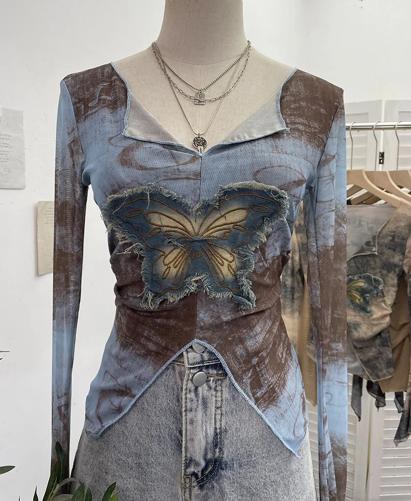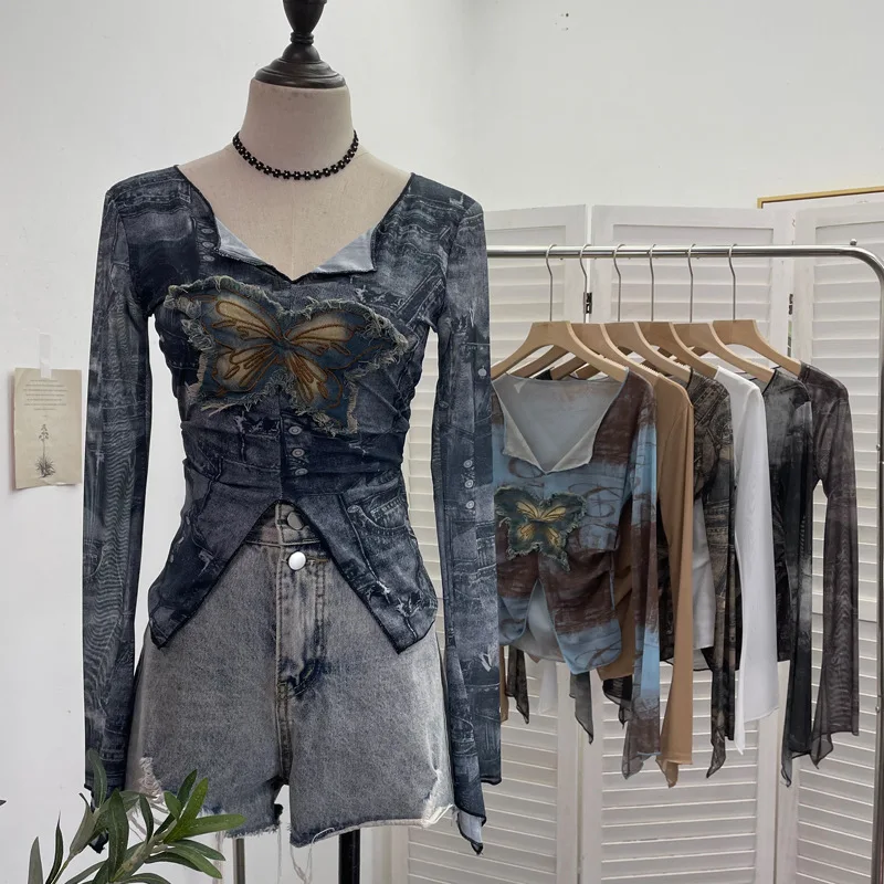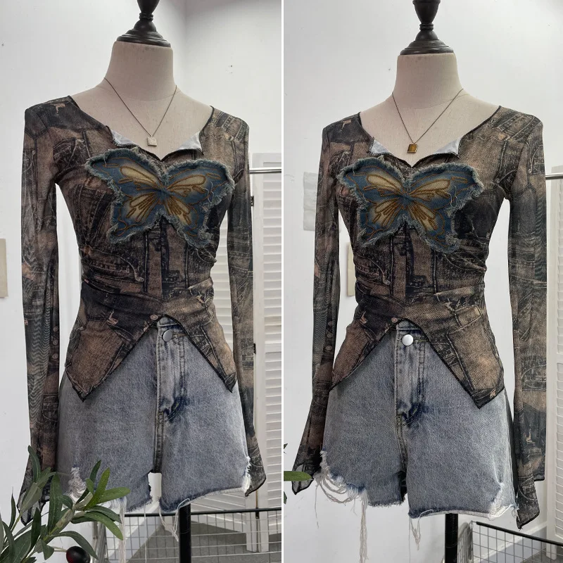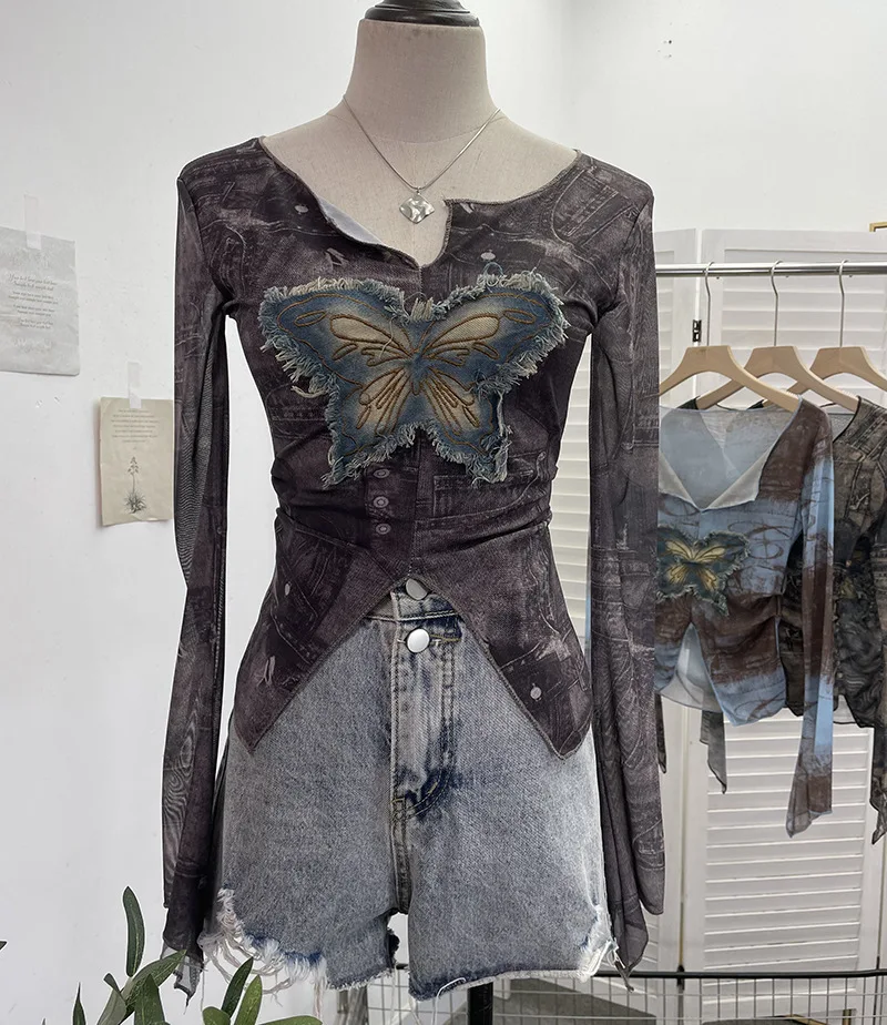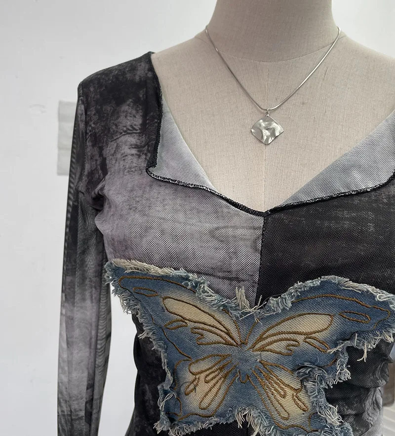 Advbridge Women's Sexy Mesh V-neck Navel-Baring T-shirt Skinny Hot Girl Denim Butterfly Embroidered Patchwork Top Essential Streetwear8921