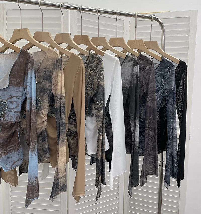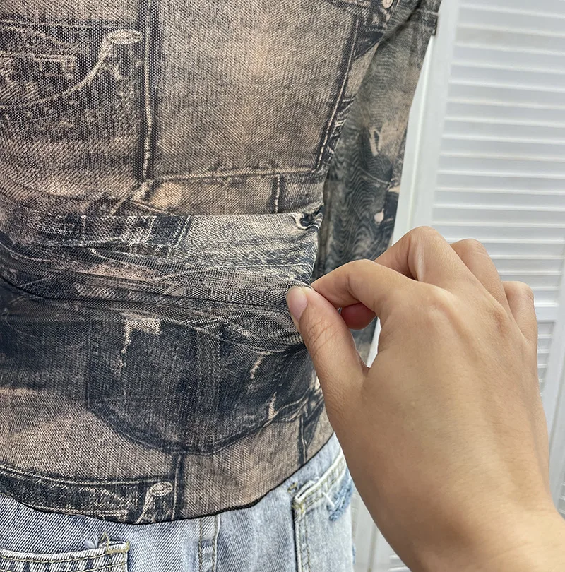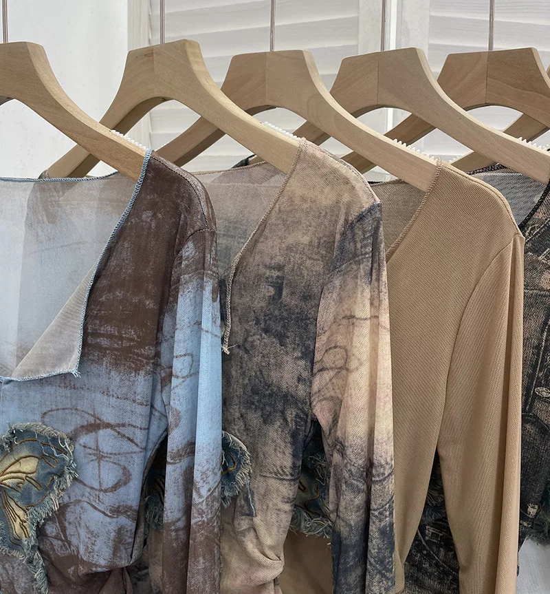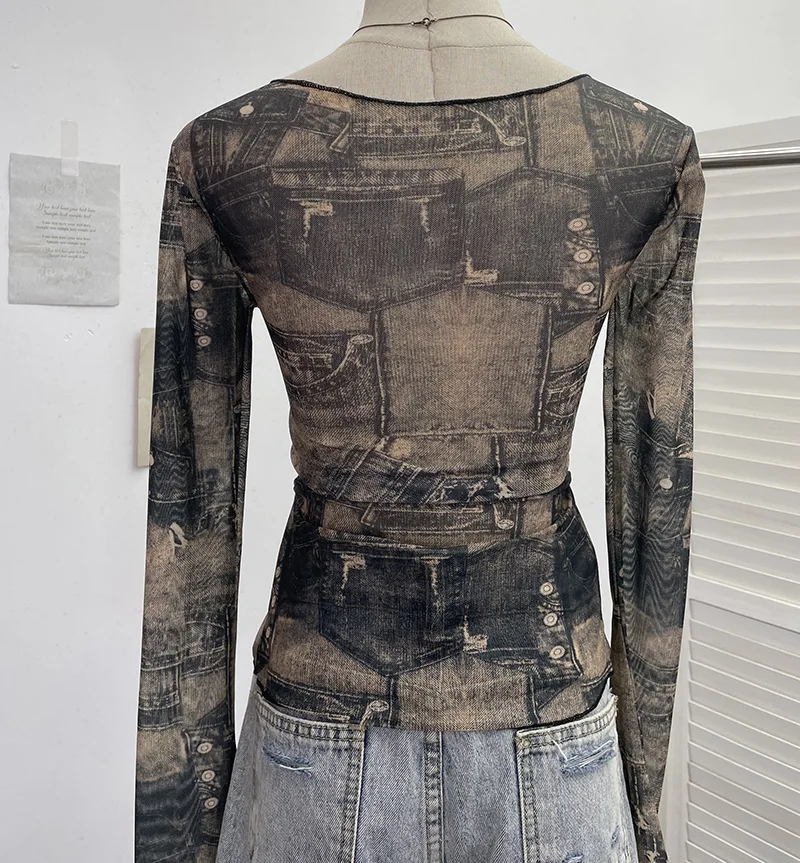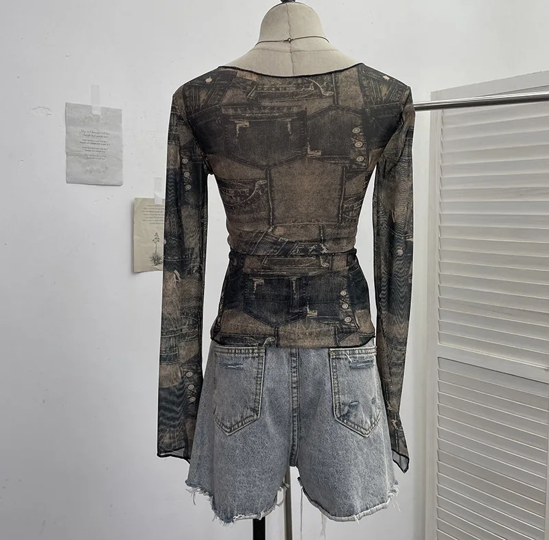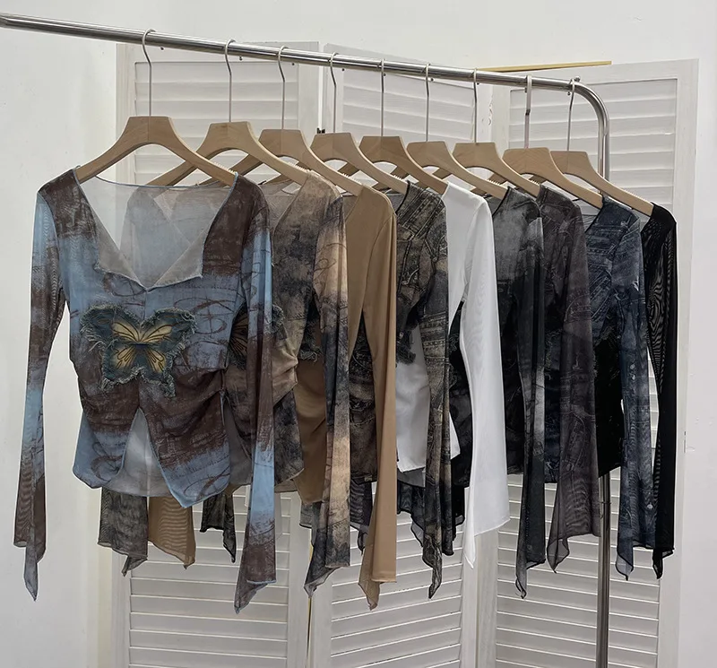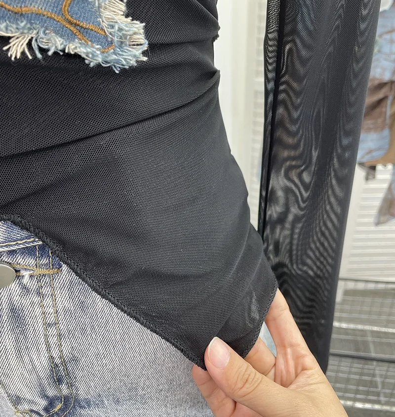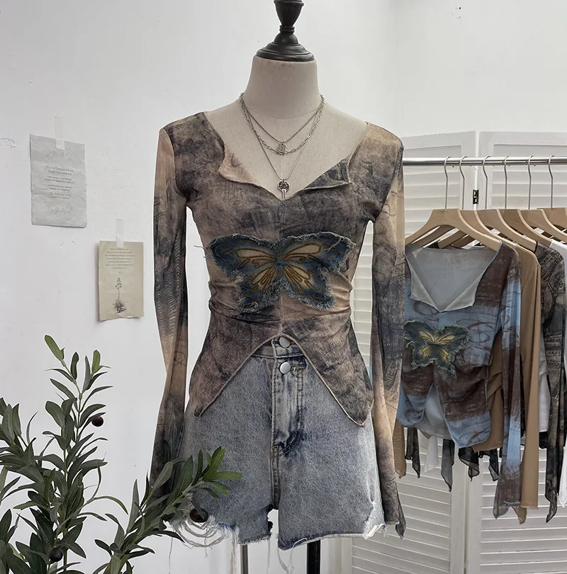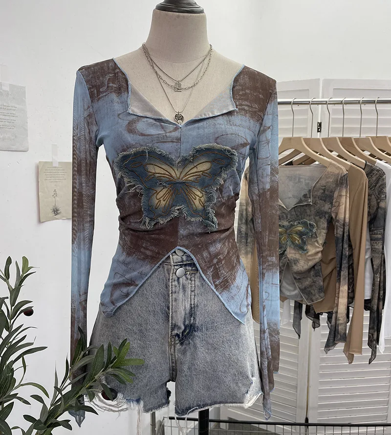 Advbridge Women's Sexy Mesh V-neck Navel-Baring T-shirt Skinny Hot Girl Denim Butterfly Embroidered Patchwork Top Essential Streetwear8921