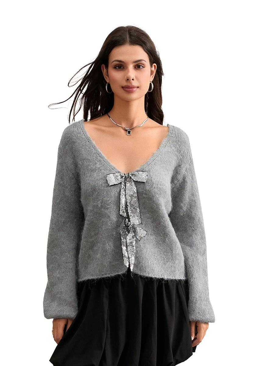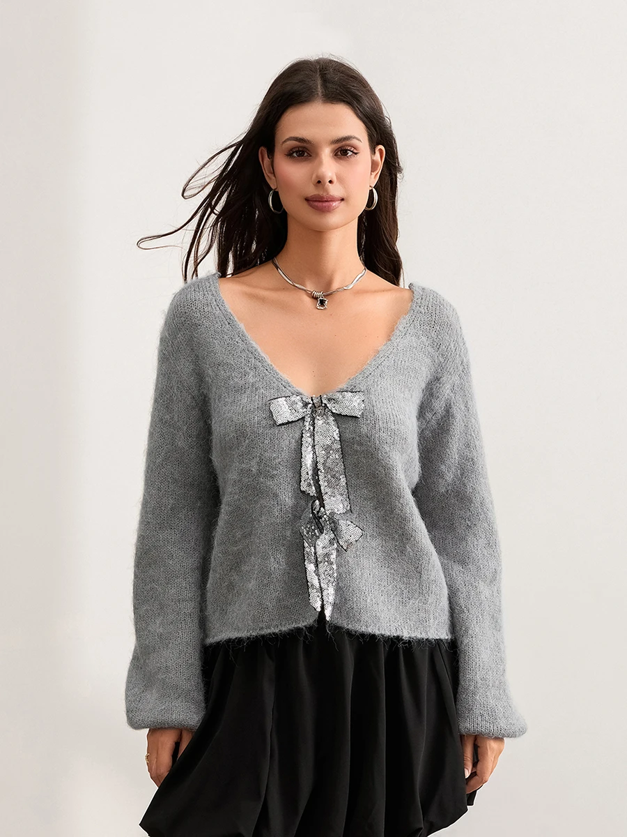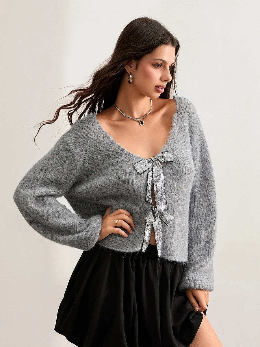 Advbridge Women's Y2K Cute Fall Glitter Sequined Bow Tied Front Loose Fit Sweater Long Sleeve V-Neck Cropped Knitwear Cardigans