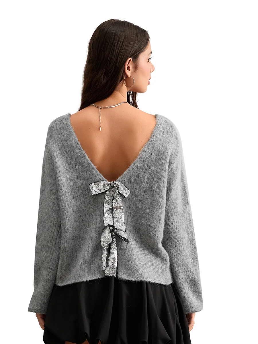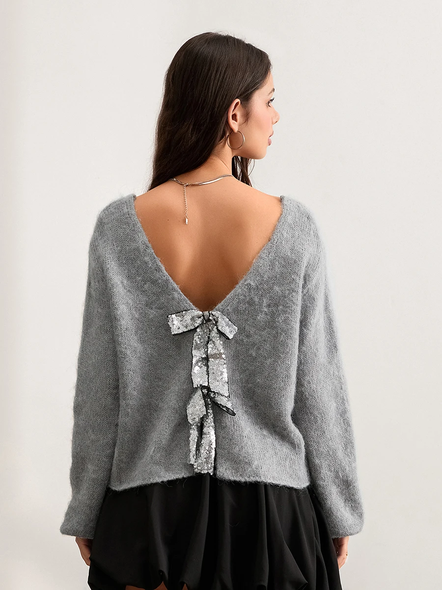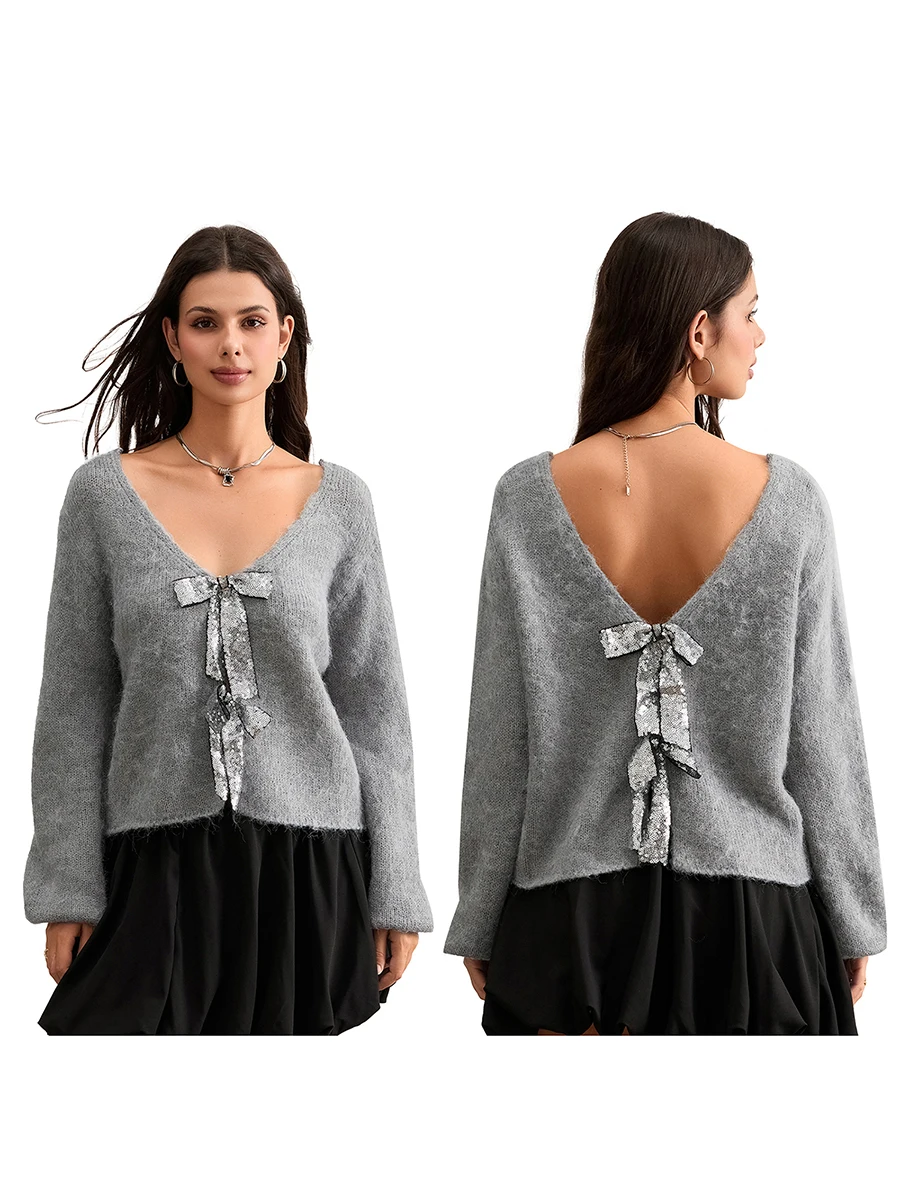 Advbridge Women's Y2K Cute Fall Glitter Sequined Bow Tied Front Loose Fit Sweater Long Sleeve V-Neck Cropped Knitwear Cardigans