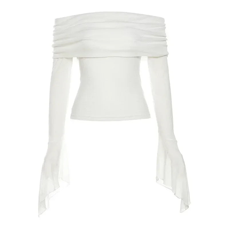 Advbridge Y2k Aesthetic Women Translucence Tee Shirts Slash Neck Long Sleeve Solid Casual T-Shirts Vintage Off Shoulder Sexy Cute Tshirts