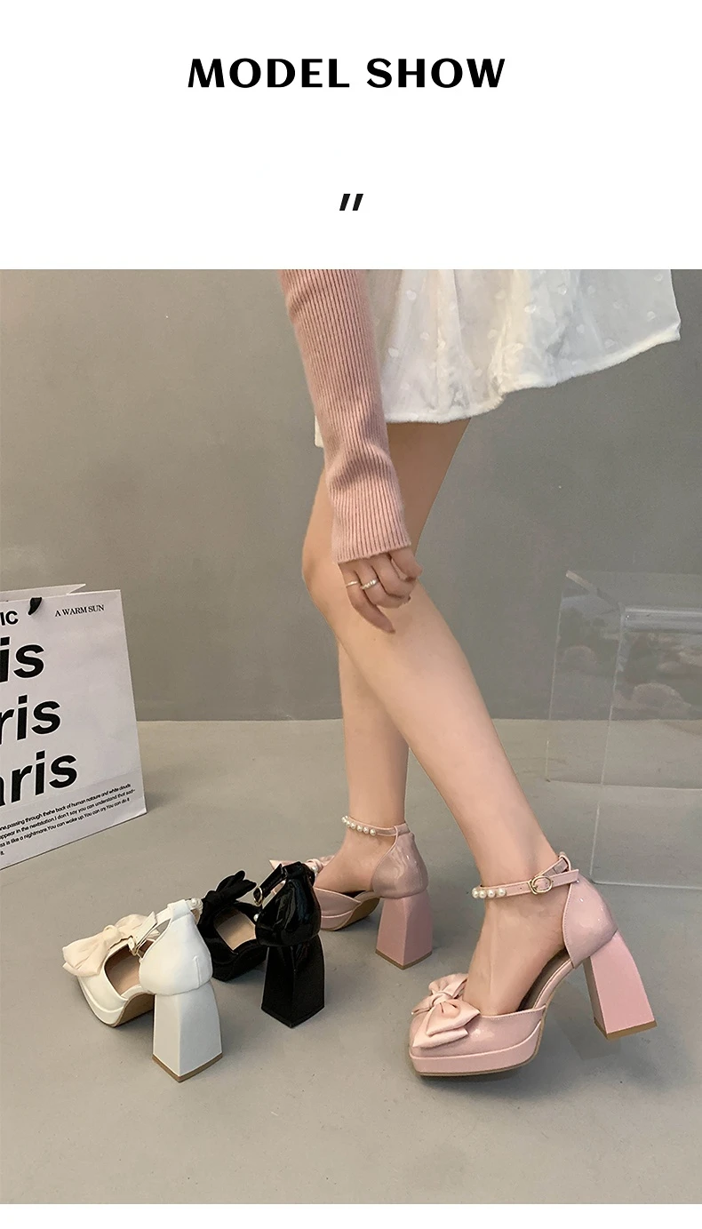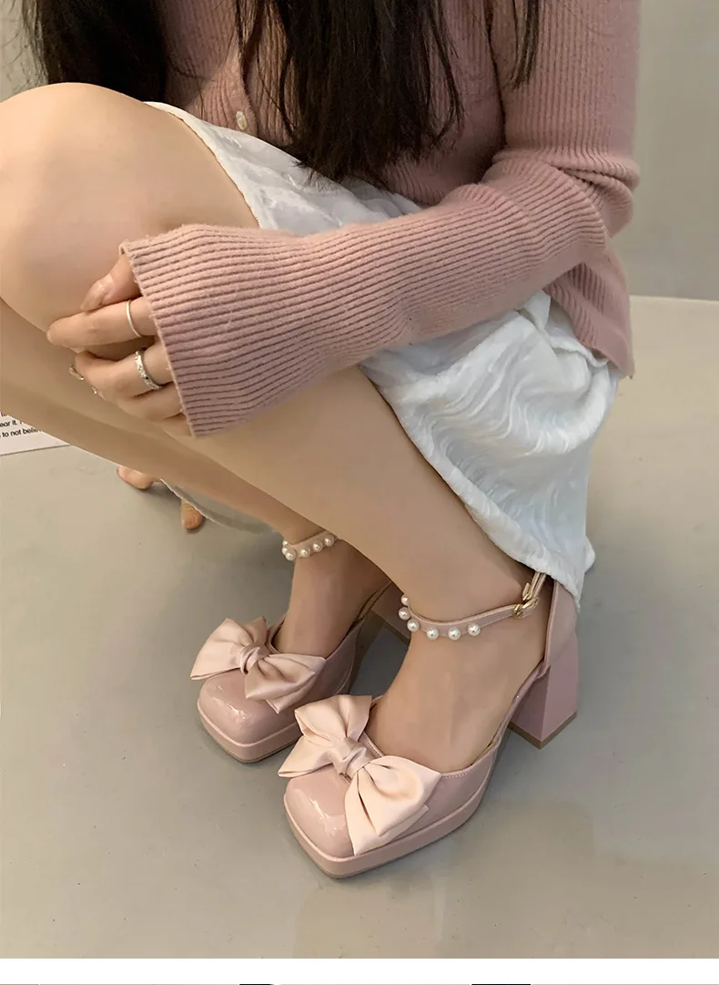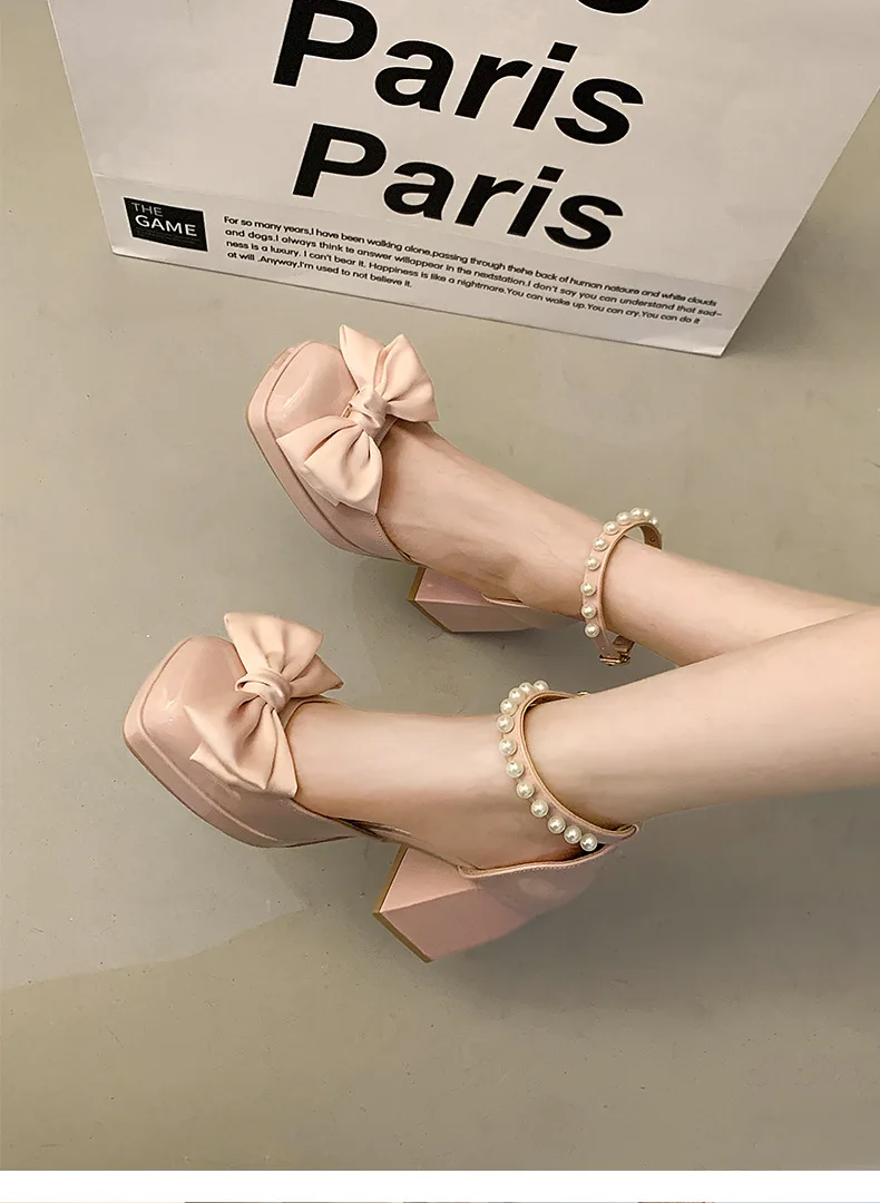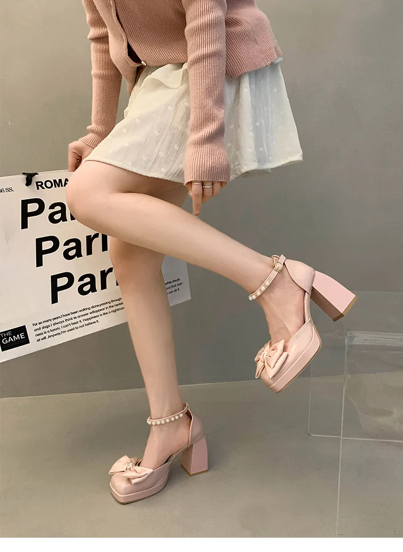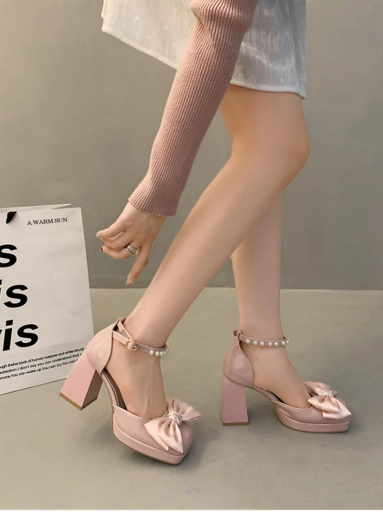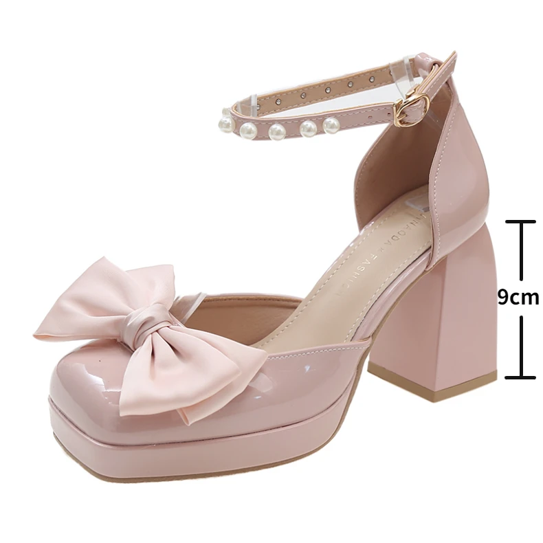 Advbridge Pink Bowknot High Heels Platform Pumps Women Summer Fashion Sweet Square Toe Chunky Sandals Party Wedding Shoes Ladies