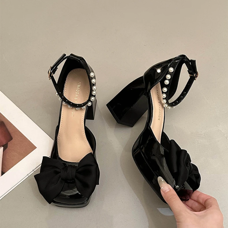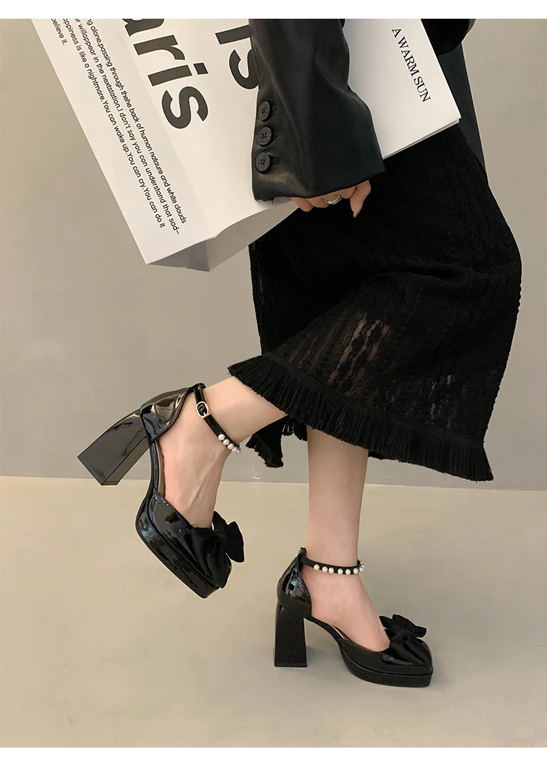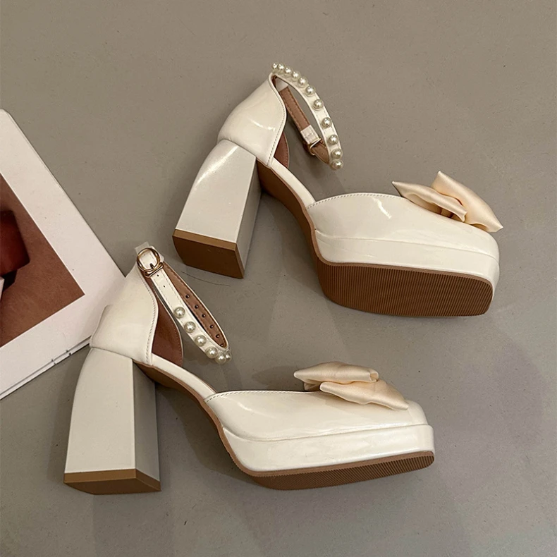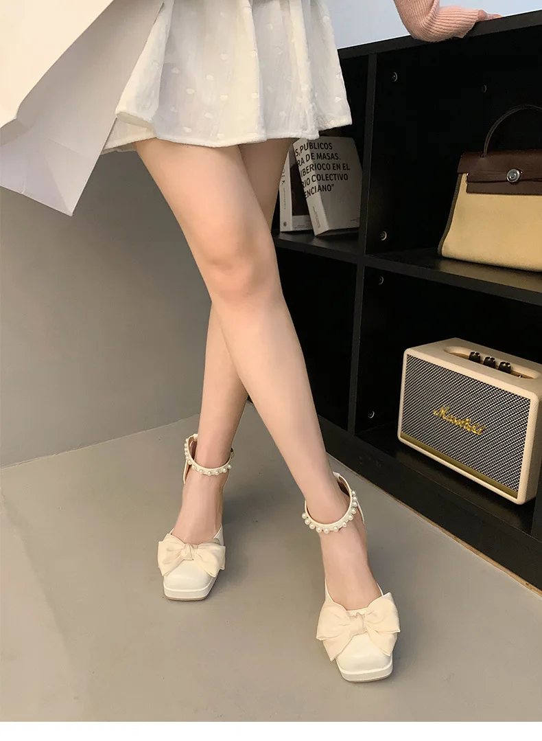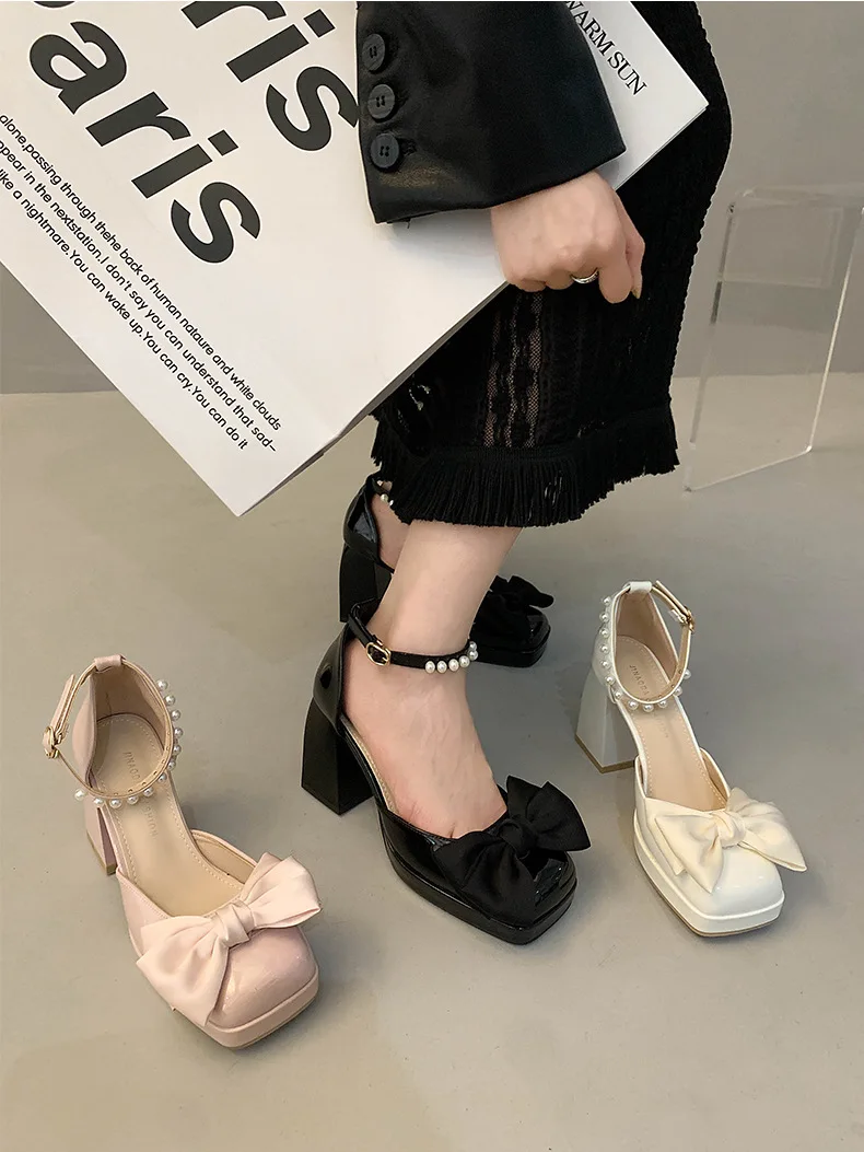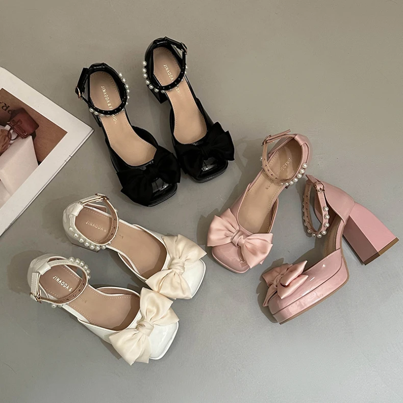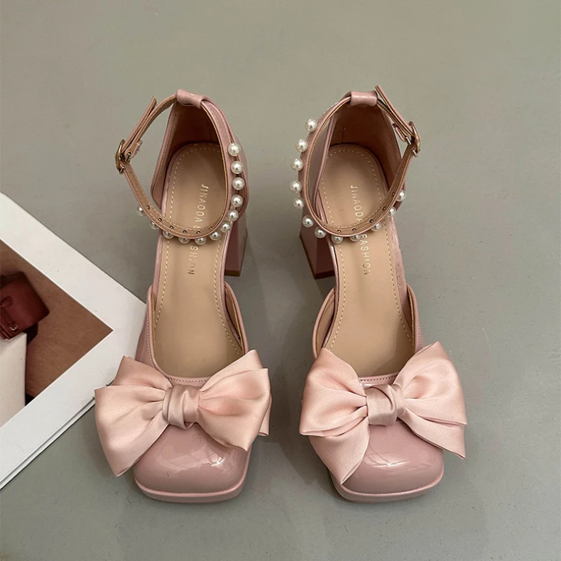 Advbridge Pink Bowknot High Heels Platform Pumps Women Summer Fashion Sweet Square Toe Chunky Sandals Party Wedding Shoes Ladies