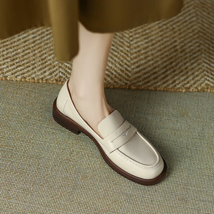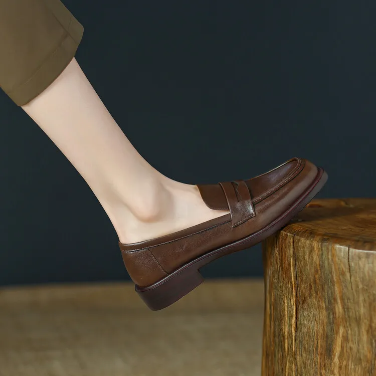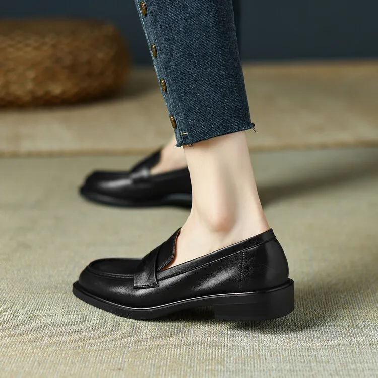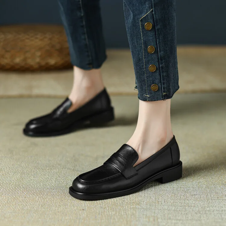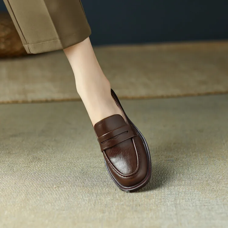 Advbridge Spring Cow Leather Women Shoes Casual Round Toe Loafers Thick Heel Slip-On Shoes for Women Retro Women Pumps Zapatos De Mujer
