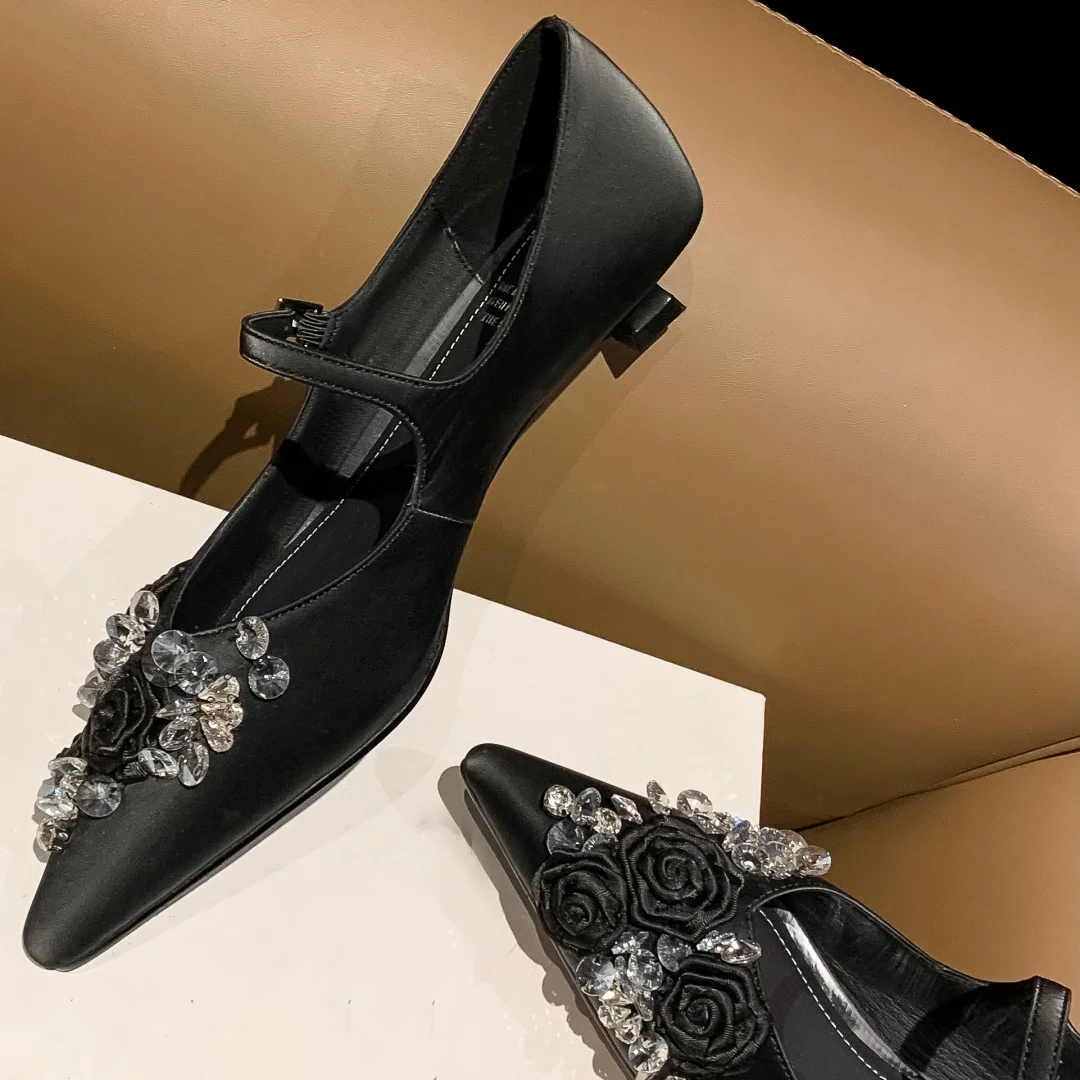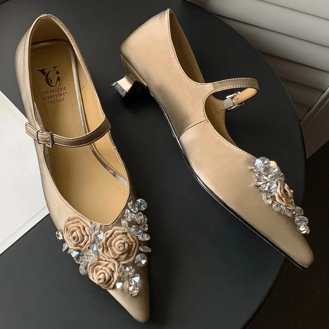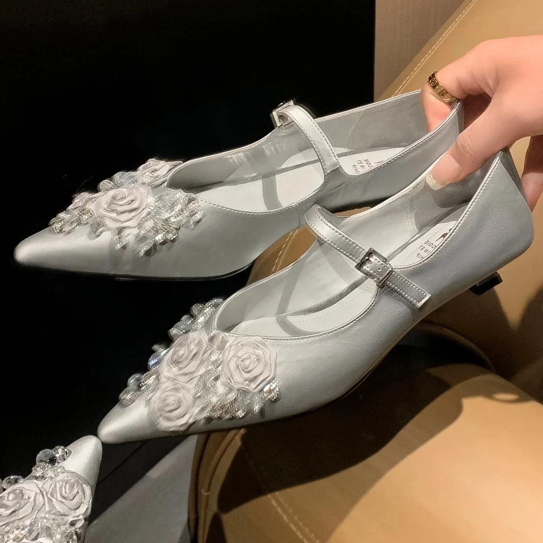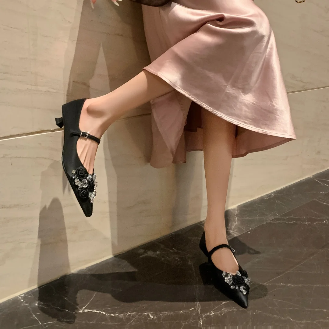 ADVBRIDGE - Women's genuine leather flower decoration pointed toe metal buckle slip-on Mary Jane pumps elegant ladies wedding kitten heels
