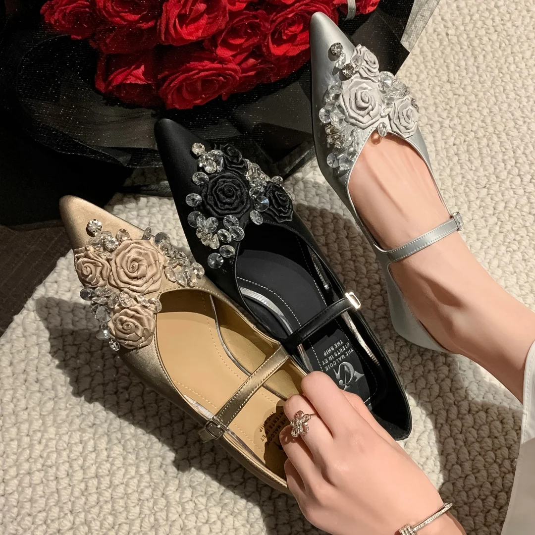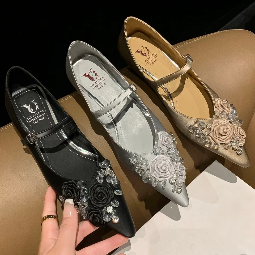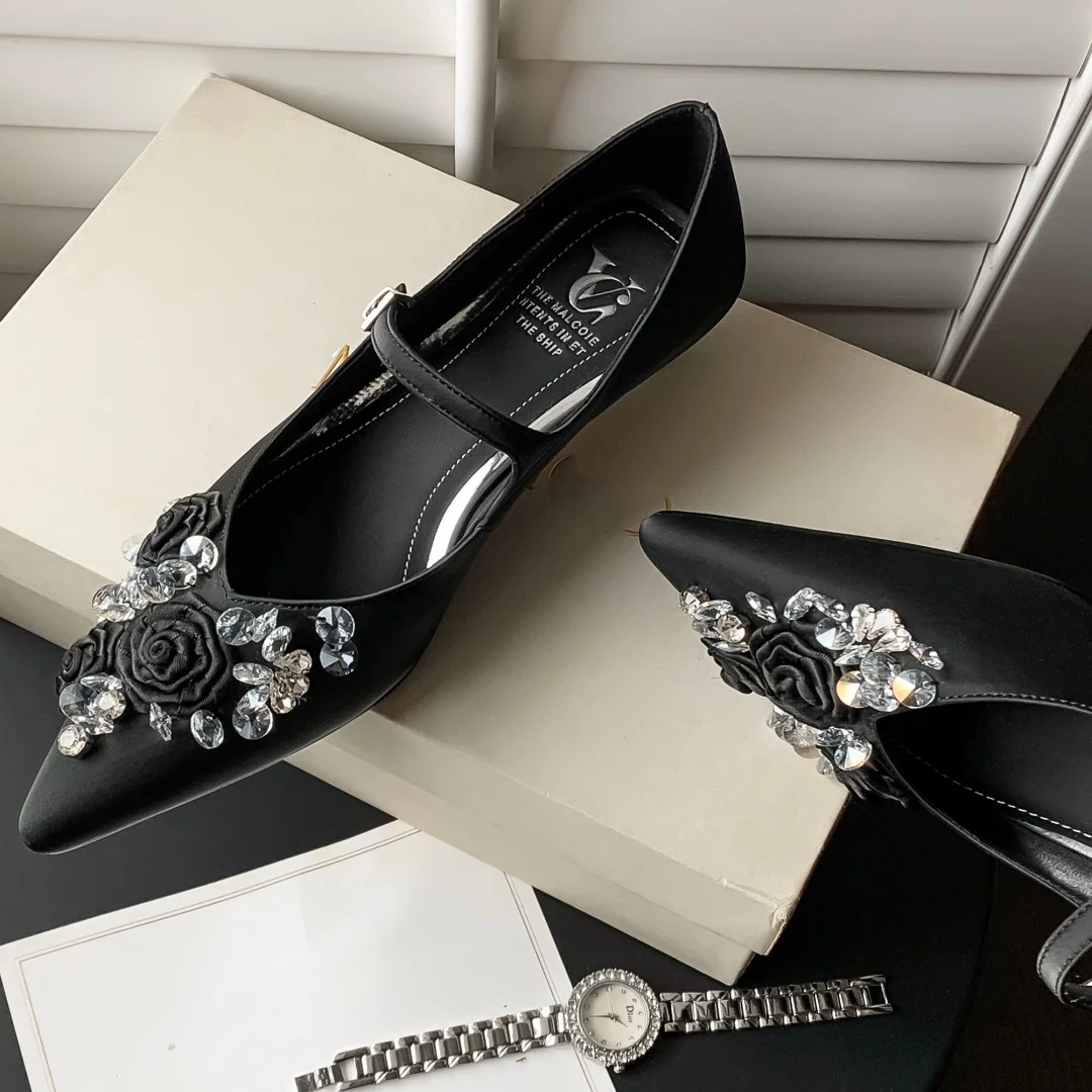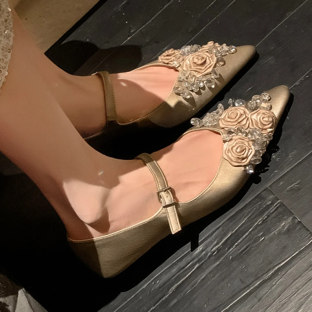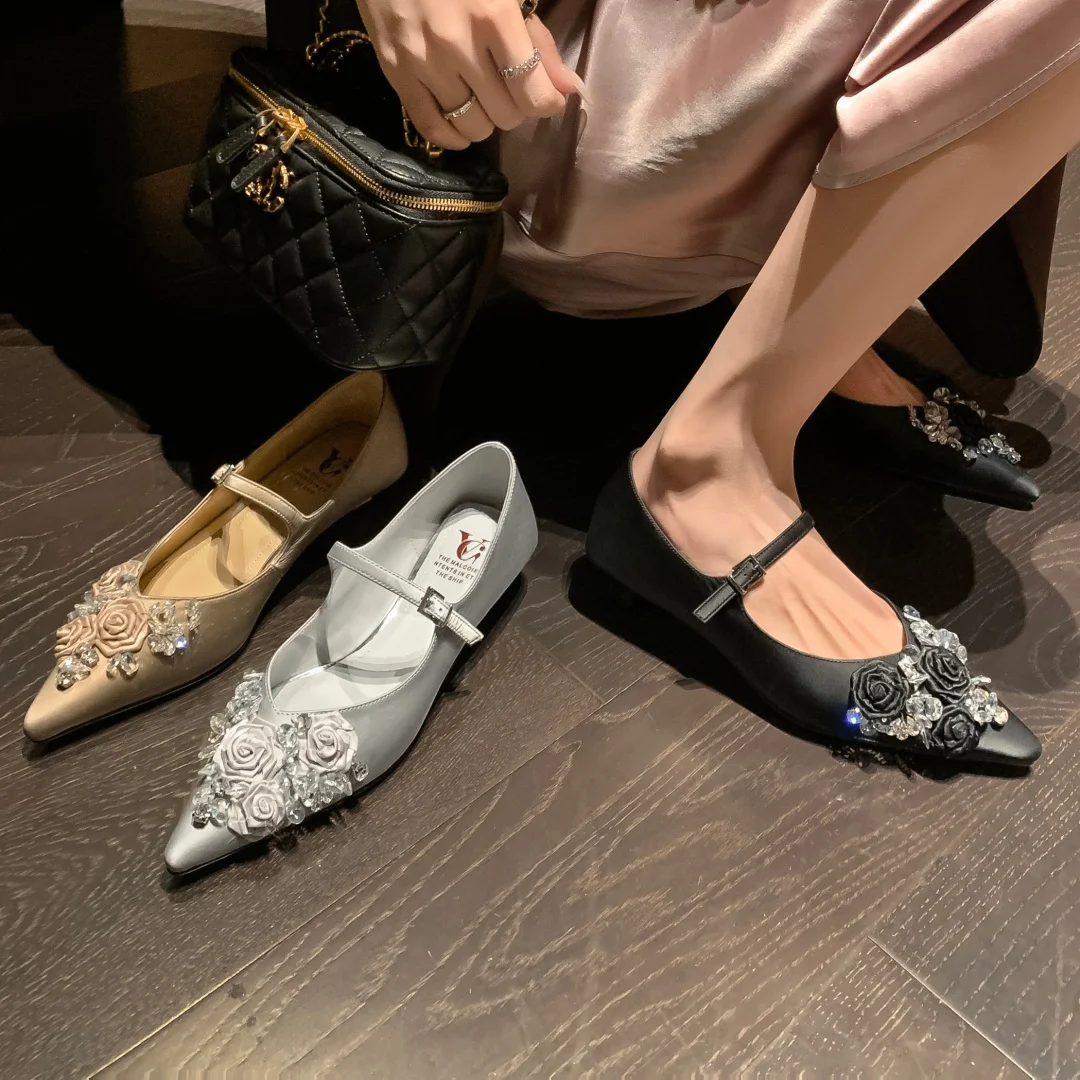 ADVBRIDGE - Women's genuine leather flower decoration pointed toe metal buckle slip-on Mary Jane pumps elegant ladies wedding kitten heels