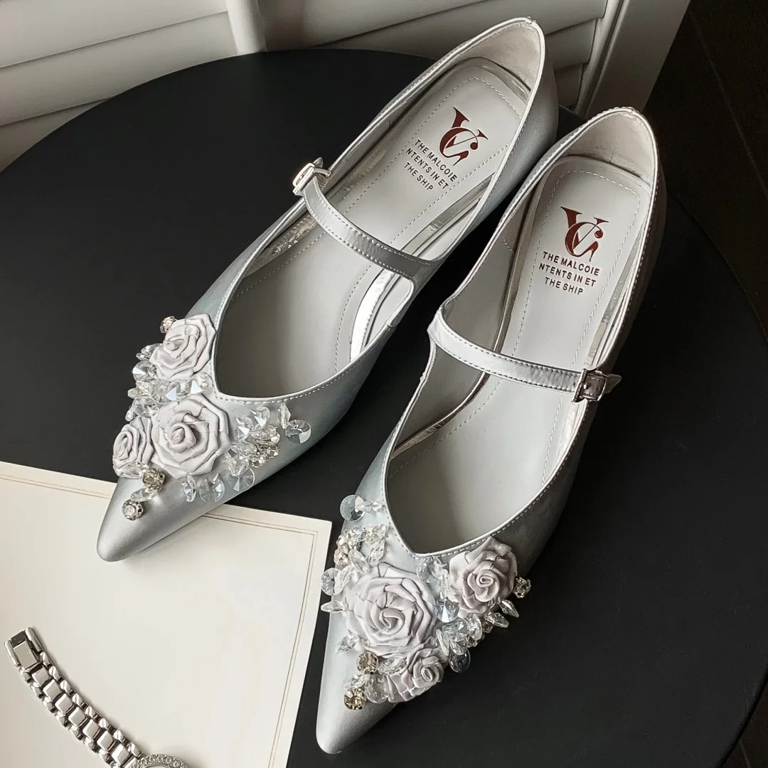 ADVBRIDGE  -  Women's genuine leather flower decoration pointed toe metal buckle slip-on Mary Jane pumps elegant ladies wedding kitten heels