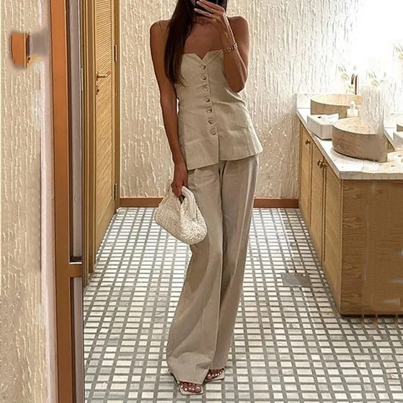 Advbridge 2 Piece Set Woman Suit Strapless Casual Tube Top Wide Leg Pants Sleeveless Solid Color For Office Button Summer Outfits