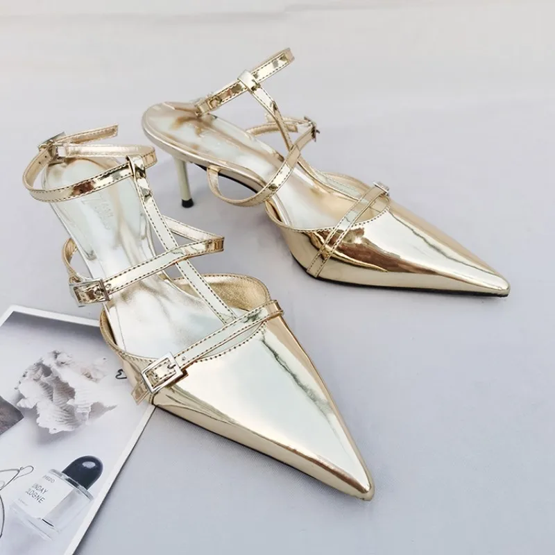 Advbridge 2023 Hollowed Out Women Shoes Crossed Thin Strap Pointed Toe High Heels Thin Heel Open Toe Sandals Senior Sense Gold Roman Pumps