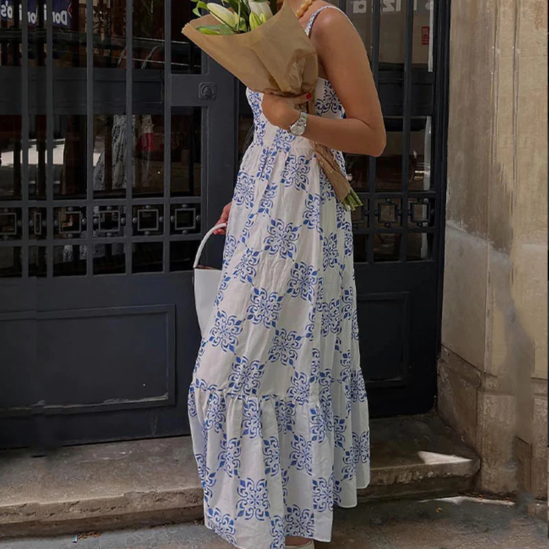 Advbridge - 2024 Elegant Off Shoulder Spaghetti Strap Dress Fashion Floral Print Pleat Loose Long Dress Casual Sleeveless Waist Party Dress