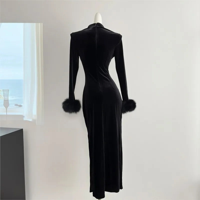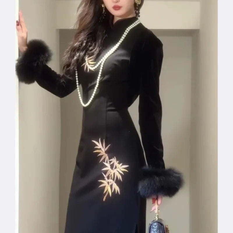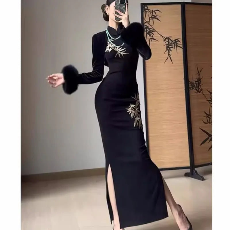 Advbridge Autumn Winter Bodycon Velvet Dress Chinese Style Long Sleeve Stand Collar Embroidery High Split Party Dresses Female Vestidos