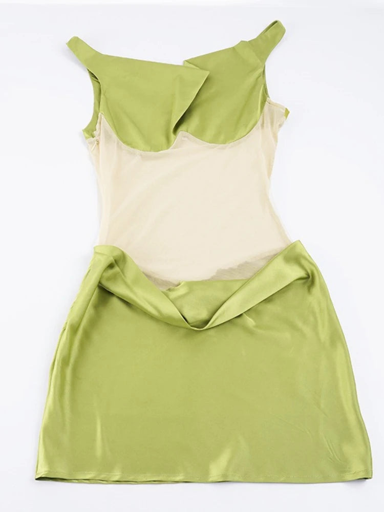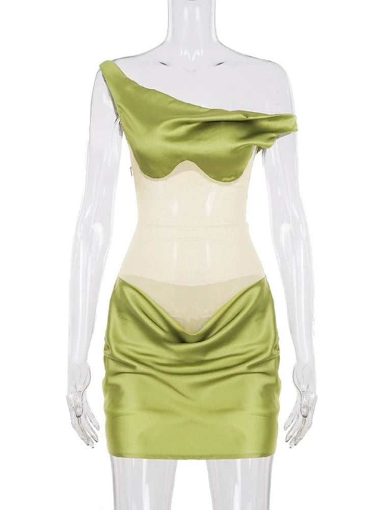 ADVBRIDGE - Elegant Light Green Satin One-Shoulder Sheer Mesh Bodycon Mini Dress Women Sexy See Through Ruched Slim Summer Party Dress